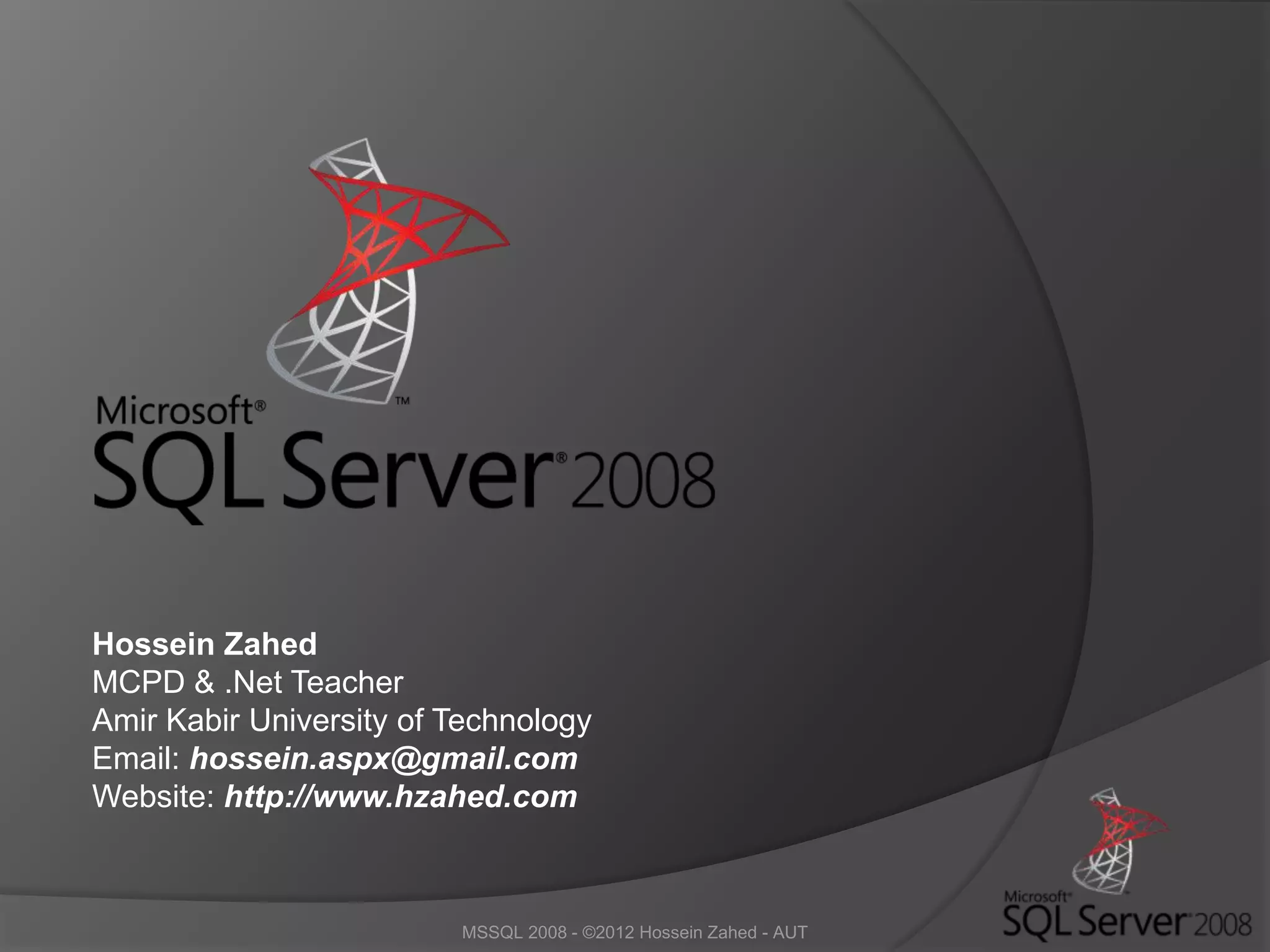The document discusses Microsoft SQL Server, including its architecture, editions, services, and development tools. It defines data, information, and knowledge. It also covers database definitions and types such as relational, document-oriented, real-time, and temporal databases. The key components of SQL Server's architecture include its storage and data types, database objects, buffer management, logging and transactions, concurrency and locking, and data retrieval.