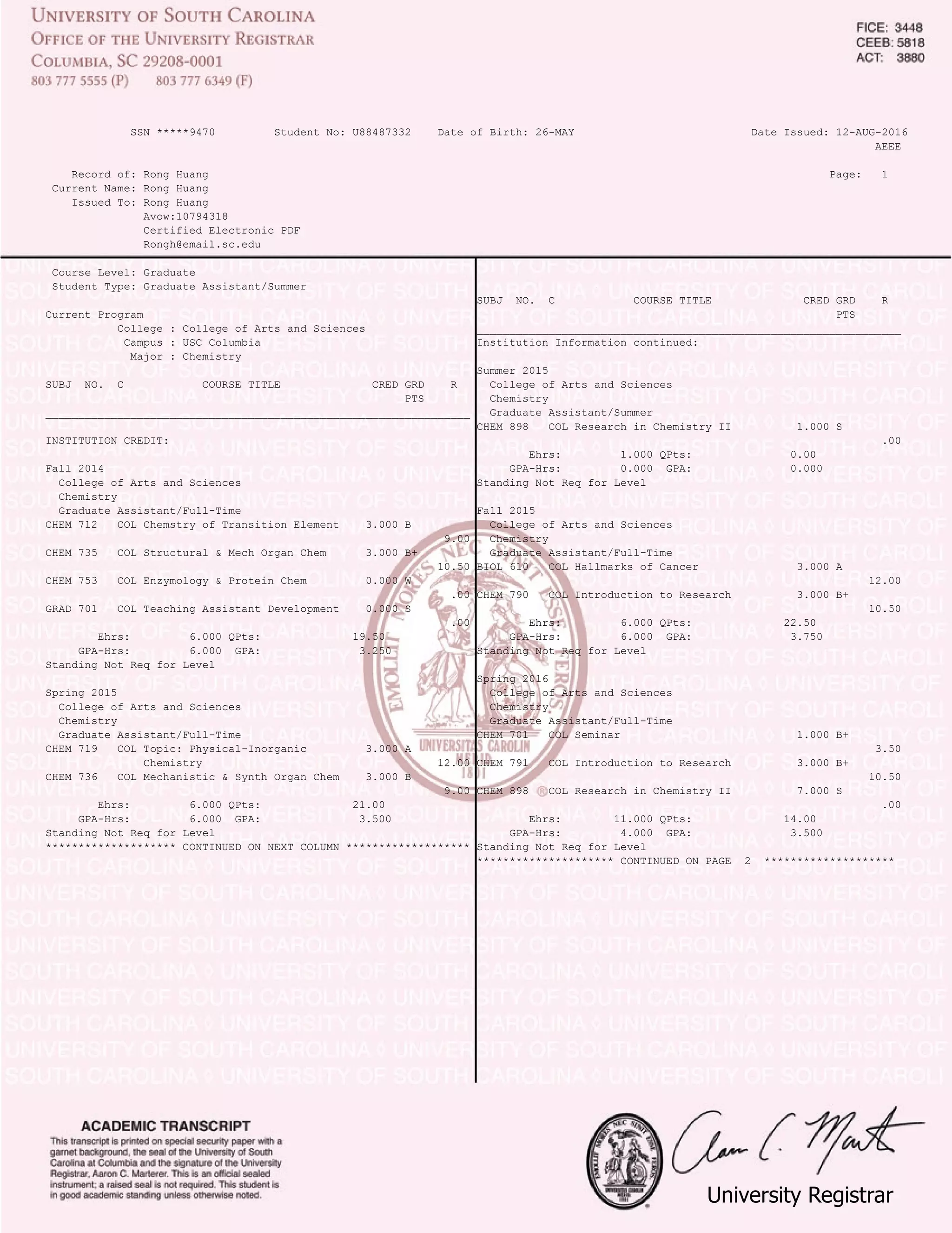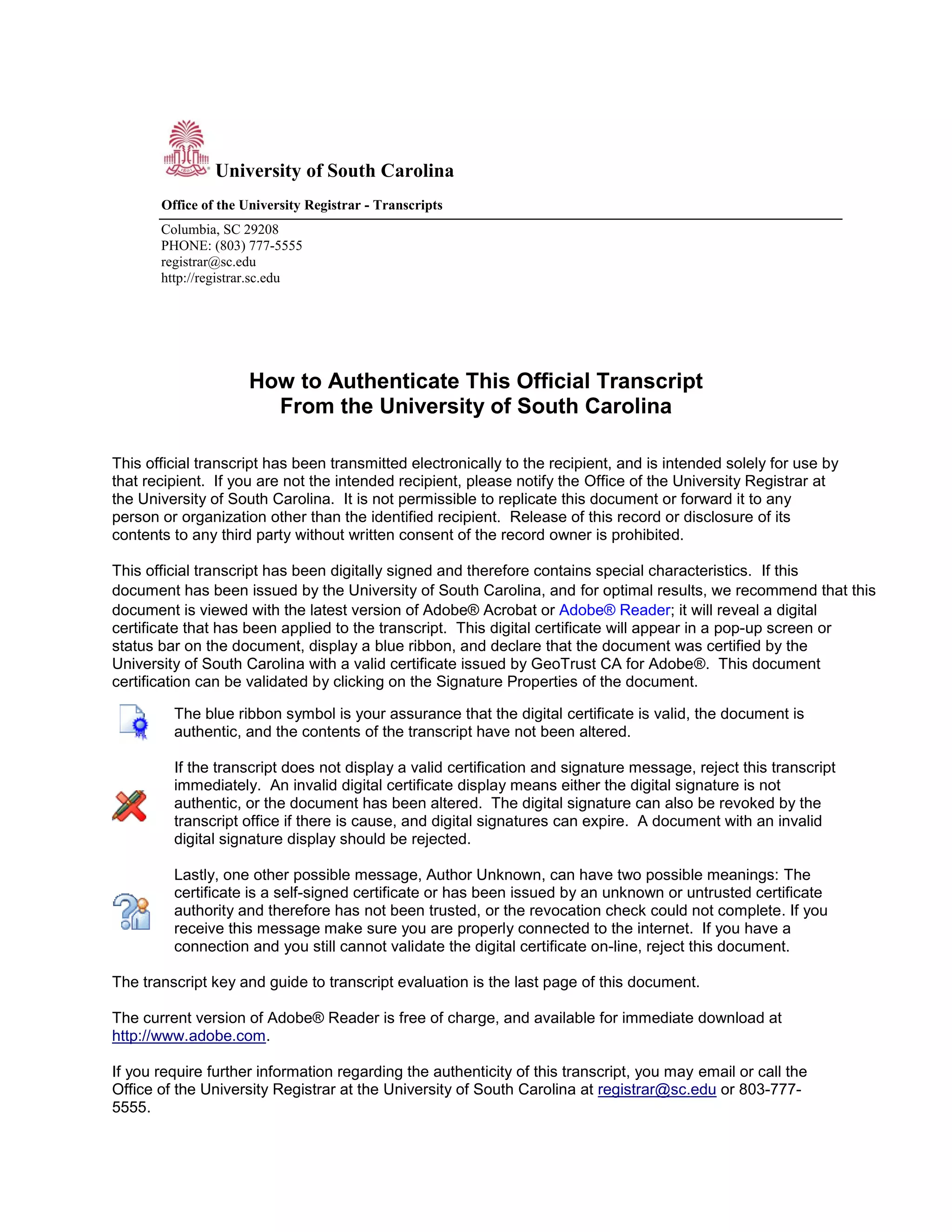 This document provides instructions for authenticating an official transcript from the University of South Carolina. It explains that the transcript has been digitally signed and contains a digital certificate that can be validated to confirm the transcript's authenticity and that the contents have not been altered. Instructions are given for how to check the digital signature and certificate and what to do if they are invalid or cannot be validated. Contact information is provided for the University of South Carolina Registrar's Office if further authentication is required.