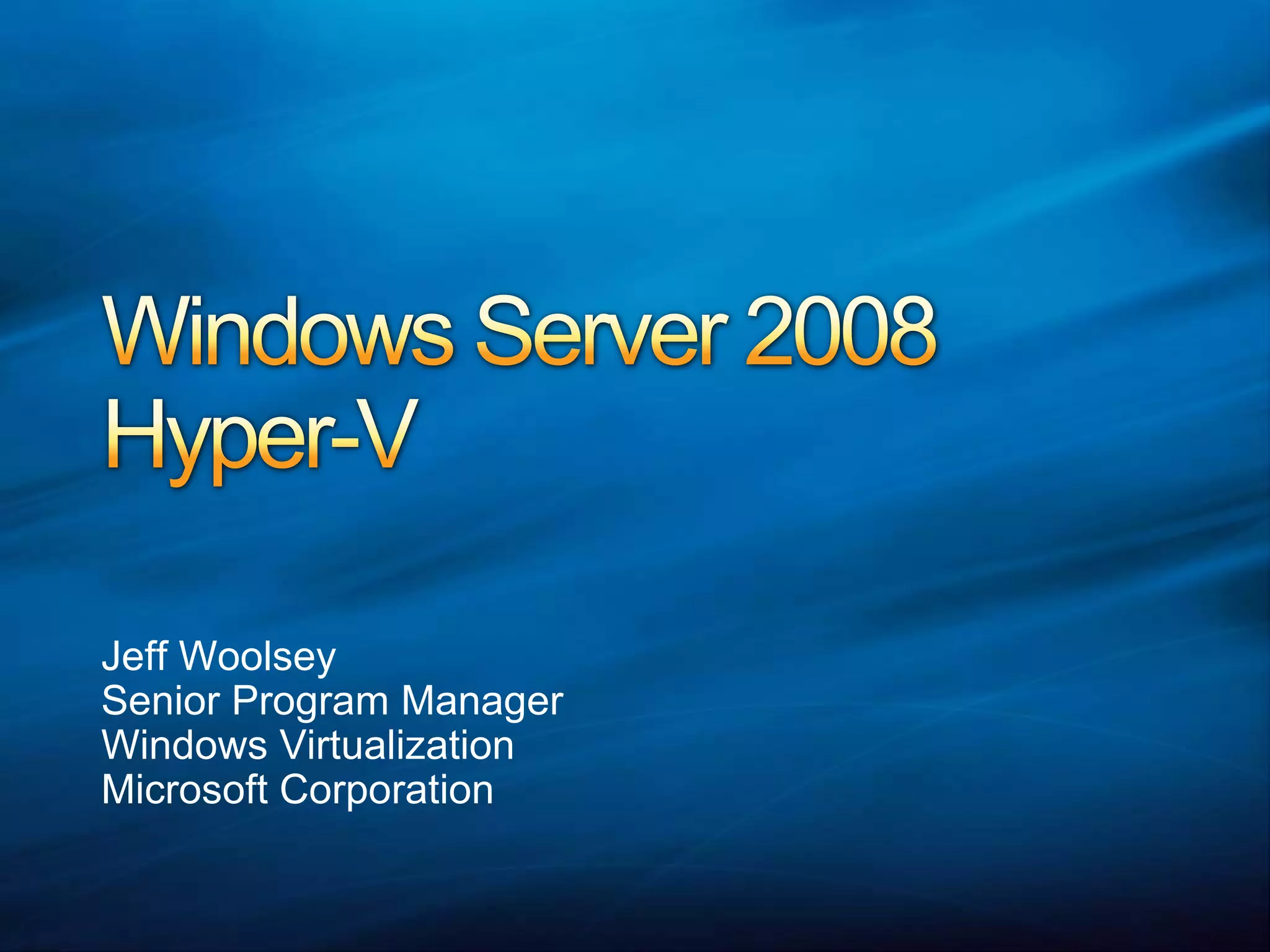 Windows Server 2008 introduces a new native virtualization platform called Hyper-V. Hyper-V utilizes hardware-assisted virtualization and provides strong isolation between virtual machines and the host operating system. Microsoft also offers System Center virtualization management products that provide centralized management and monitoring of virtual machines. While virtualization adoption remains relatively low, Microsoft estimates around 17% of servers will be virtualized by 2010, representing significant growth and opportunity in the virtualization market.
