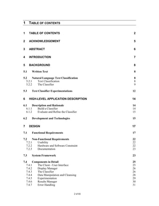 This document provides background information on a management and visualization tool for text mining applications developed by Peishan Mao for her MSc project. It discusses natural language text classification and describes how suffix trees can be used to represent documents at a more granular level than traditional "bag-of-words" models. The document outlines the design of the tool, which aims to provide a flexible framework for text classification experiments and allow evaluation and refinement of classifiers. It also describes the implementation of the tool in C# with a Windows Forms interface and Access database.