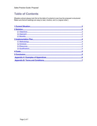 This document provides a template for a sales proposal with guidelines on how to structure the content. It suggests including sections on the current situation, the proposed solution and its objectives/approach/benefits, an implementation plan with methodology/schedule/resources/qualifications, costs, and a conclusion. The template emphasizes clearly outlining the client's needs, how the solution meets their objectives, quantifying benefits, and building confidence in successful delivery through a well-planned implementation approach.