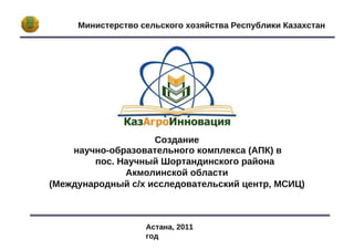 Документ описывает создание Международного сельскохозяйственного исследовательского центра (МСИЦ) в Казахстане, целью которого является повышение производительности труда и обеспечение продовольственной безопасности. МСИЦ будет осуществлять фундаментальные и прикладные исследования, а также подготовку научных кадров в аграрной сфере. В центре предусмотрены современные лаборатории и платформы для проведения экспериментов и транфера технологий.