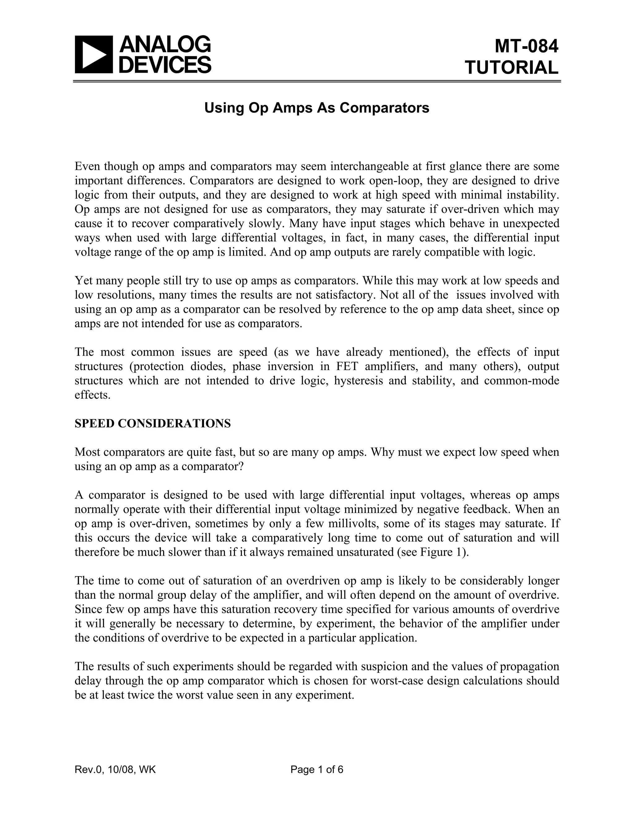 While op amps and comparators seem similar, op amps have important limitations when used as comparators. Op amps are not designed to drive logic circuits directly, may saturate and recover slowly when overdriven, and their input and output stages can behave unexpectedly with large signals. Comparators are specifically designed to work open-loop, drive logic circuits at high speeds with minimal instability, and handle large differential input voltages. While op amps may work as comparators at low speeds and resolutions, their performance is generally not satisfactory and stability, speed, and input/output behavior must be carefully evaluated against the data sheet.