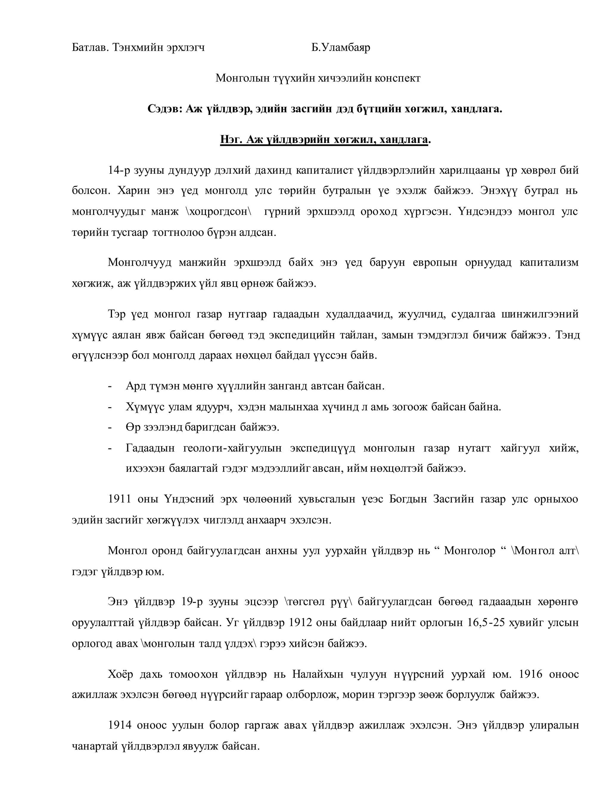 Б.Уламбаяр Монголын түүхийн хичээлийн конспект Сэдэв: Аж үйлдвэр, эдийн засгийн дэд бүтцийн хөгжил, хандлага. Нэг. Аж үйлдвэрийн хөгжил, хандлага. 14-р зууны дундуур дэлхий дахинд капиталист үйлдвэрлэлийн харилцааны үр хөврөл бий болсон. Харин энэ үед монголд улс төрийн бутралын үе эхэлж байжээ. Энэхүү бутрал нь монголчуудыг манж хоцрогдсон гүрний эрхшээлд ороход хүргэсэн. Үндсэндээ монгол улс төрийн тусгаар тогтнолоо бүрэн алдсан. Монголчууд манжийн эрхшээлд байх энэ үед баруун европын орнуудад капитализм хөгжиж, аж үйлдвэржих үйл явц өрнөж байжээ. Тэр үед монгол газар нутгаар гадаадын худалдаачид, жуулчид, судалгаа шинжилгээний хүмүүс аялан явж байсан бөгөөд тэд экспедицийн тайлан, замын тэмдэглэл бичиж байжээ . Тэнд өгүүлснээр бол монголд дараах нөхцөл байдал үүссэн байв. - Ард түмэн мөнгө хүүллийн занганд автсан байсан. - Хүмүүс улам ядуурч, хэдэн малынхаа хүчинд л амь зогоож байсан байна. - Өр зээлэнд баригдсан байжээ. - Гадаадын геологи-хайгуулын экспедицүүд монголын газар н утагт хайгуул хийж, ихээхэн баялагтай гэдэг мэдээллийг авсан, ийм нөхцөлтэй байжээ. 1911 оны Үндэсний эрх чөлөөний хувьсгалын үеэс Богдын Засгийн газар улс орныхоо эдийн засгийг хөгжүүлэх чиглэлд анхаарч эхэлсэн. Монгол оронд байгуулагдсан анхны уул уурхайн үйлдвэр нь “ Монголор “ Мон гол алт гэдэг үйлдвэр юм. Энэ үйлдвэр 19-р зууны эцсээр төгсгөл рүү байгуулагдсан бөгөөд гадааадын хөрөнгө оруулалттай үйлдвэр байсан. Уг үйлдвэр 1912 оны байдлаар нийт орлогын 16,5-25 хувийг улсын орлогод авах монголын талд үлдэх гэрээ хийсэн байжээ. Хоёр дахь томоохон үйлдвэр нь Налайхын чулуун н үүрсний уурхай юм. 1916 оноос ажиллаж эхэлсэн бөгөөд нүүрсийг гараар олборлож, морин тэргээр зөөж борлуулж байжээ. 1914 оноос уулын болор гаргаж авах үйлдвэр ажиллаж эхэлсэн. Энэ үйлдвэр улиралын чанартай үйлдвэрлэл явуулж байсан.