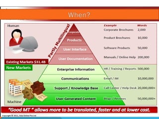 The document discusses the functionalities of the CCID Intelligent Translation System, which provides complete translation solutions between English and Chinese using advanced hybrid machine translation technology. It highlights the system's capabilities in automatic translation, cost reduction, bilingual material management, and support for various document formats, enhancing user experience in office software. Overall, it emphasizes the system's role in improving translation accuracy and efficiency for diverse customer needs.