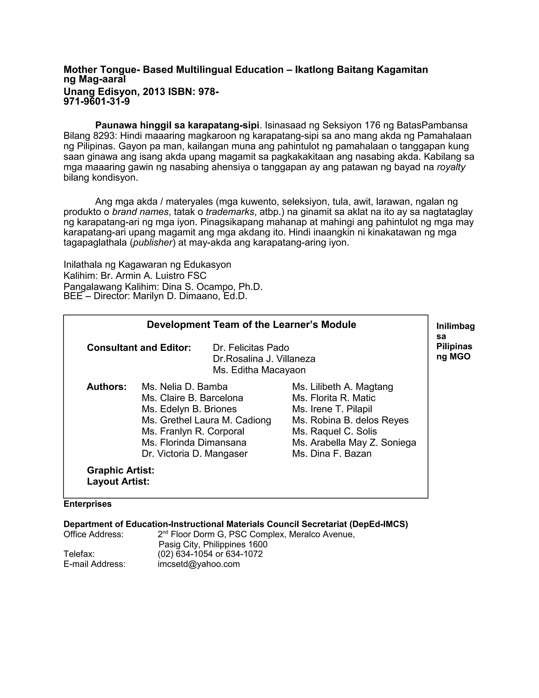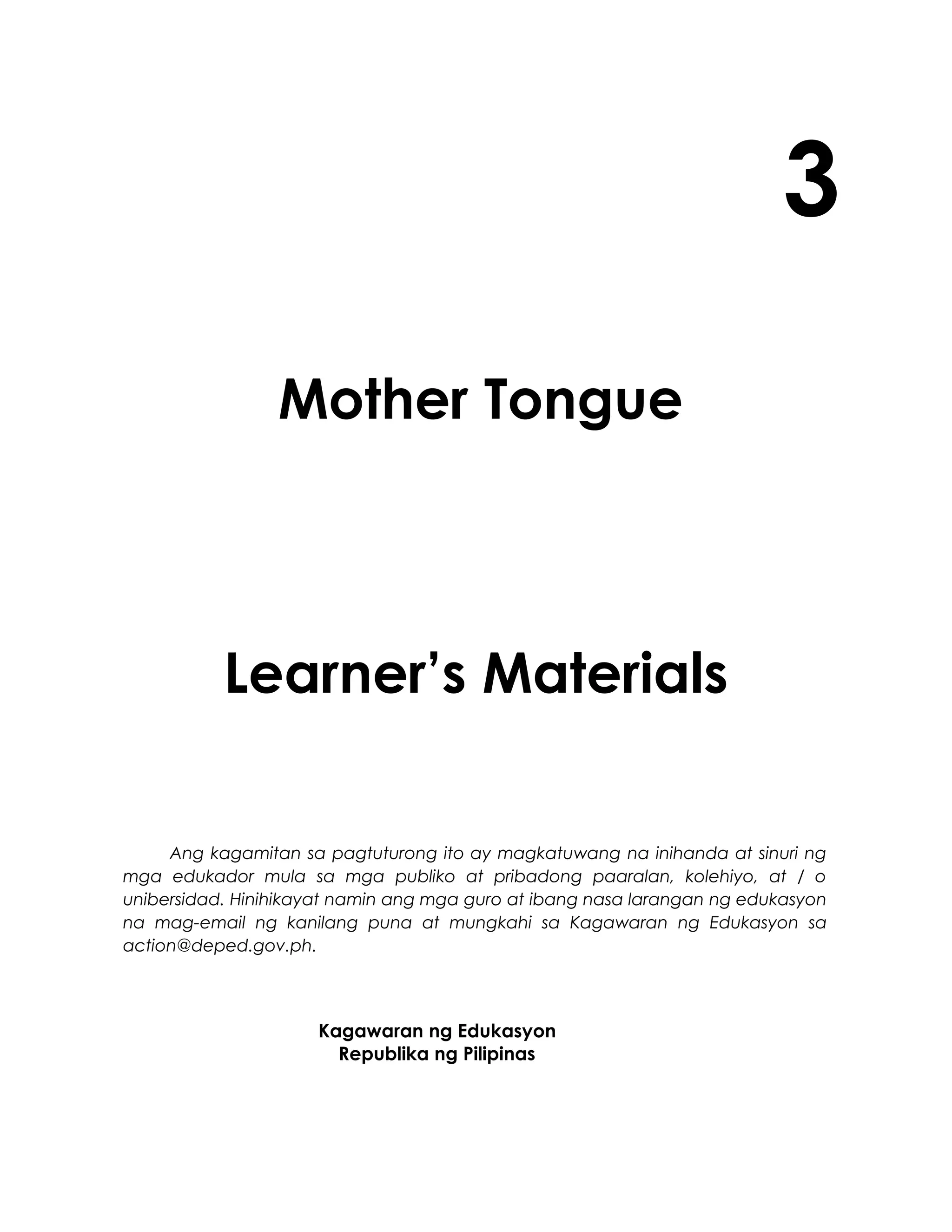 Ang dokumentong ito ay isang materyal na inihanda para sa mga mag-aaral sa ikatlong baitang, na tumutukoy sa paggamit ng mother tongue-based multilingual education. Kasama dito ang mga paalala hinggil sa karapatang-sipi at ang mga akdang ginamit, pati na rin ang mga gawain at mga aralin na dapat isagawa ng mga mag-aaral. Ang layunin nito ay mapadali ang pagkatuto ng mga bata sa kanilang sariling wika habang natututo ng iba pang mga wika.