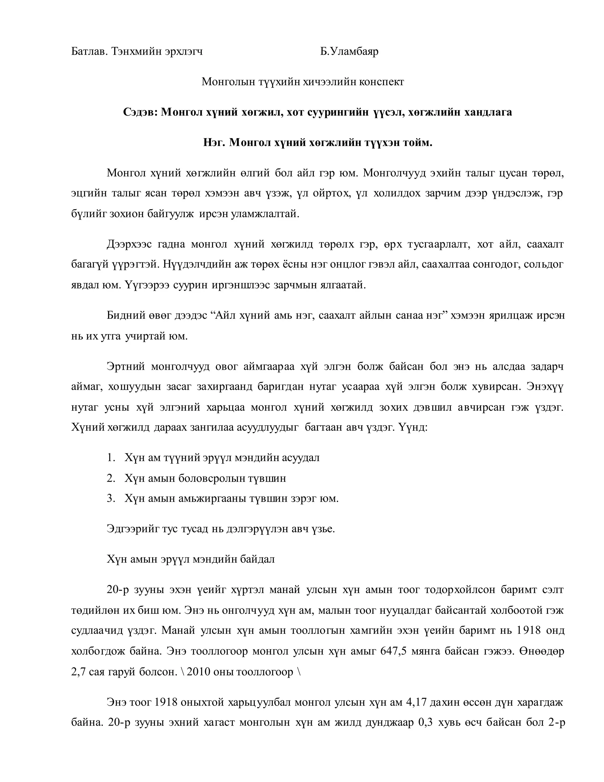 Б.Уламбаяр Монголын түүхийн хичээлийн конспект Сэдэв: Монгол хүний хөгжил, хот суурингийн үүсэл, хөгжлийн хандлага Нэг. Монгол хүний хөгжлийн түүхэн тойм. Монгол хүний хөгжлийн өлгий бол айл гэр юм. Монголчууд эхийн талыг цусан төрөл, эцгийн талыг ясан төрөл хэмээн авч үзэж, үл ойртох, үл холилдох зарчим дээр үндэслэж, гэр бүлийг зохион байгуулж ирсэн уламжлалтай. Дээрхээс гадна монгол хүний хөгжилд төрөлх гэр, өрх тусгаарлалт, хот айл, саахалт багагүй үүрэгтэй. Нүүдэлчдийн аж төрөх ёсны нэг онцлог гэвэл айл, саахалтаа сонгодог, сольдог явдал юм. Үүгээрээ суурин иргэншлээс зарчмын ялгаатай. Бидний өвөг дээдэс “Айл хүний амь нэг, саахалт айлын санаа нэг” хэмээн ярилцаж ирсэн нь их утга учиртай юм. Эртний монголчууд овог аймгаараа хүй элгэн болж байсан бол энэ нь алсдаа задарч аймаг, хошуудын засаг захиргаанд баригдан нутаг усаараа хүй элгэн болж хувирсан. Энэхүү нутаг усны хүй элгэний харьцаа монгол хүний хөгжилд зохих дэвшил авчирсан гэж үздэг. Хүний хөгжилд дараах зангилаа асуудлуудыг багтаан авч үздэг. Үүнд: 1. Хүн ам түүний эрүүл мэндийн асуудал 2. Хүн амын боловсролын түвшин 3. Хүн амын амьжиргааны түвшин зэрэг юм. Эдгээрийг тус тусад нь дэлгэрүүлэн авч үзье. Хүн амын эрүүл мэндийн байдал 20-р зууны эхэн үеийг хүртэл манай улсын хүн амын тоог тодорхойлсон баримт сэлт төдийлөн их биш юм. Энэ нь онголчууд хүн ам, малын тоог нууцалдаг байсантай холбоотой гэж судлаачид үздэг. Манай улсын хүн амын тооллогын хамгийн эхэн үеийн баримт нь 1 918 онд холбогдож байна. Энэ тооллогоор монгол улсын хүн амыг 647,5 мянга байсан гэжээ. Өнөөдөр 2,7 сая гаруй болсон. 2010 оны тооллогоор Энэ тоог 1918 оныхтой харьц уулбал монгол улсын хүн ам 4,17 дахин өссөн дүн харагдаж байна. 20-р зууны эхний хагаст монголын хүн ам жилд дунджаар 0,3 хувь өсч байсан бол 2-р