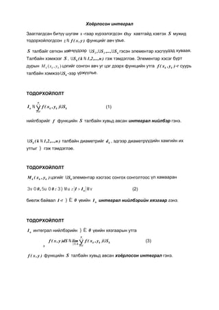 шугам -гаар хүрээлэгдсэн Oxy хавтгайд хэвтэх S мужид тодорхойлогдсон )y,x(fz функцийг авч үзье. S талбайг сеткэн хөвчүүдээр n21 S,...,S,S гэсэн элементар хэсгүүдэд хуваая. Талбайн хэмжээг S , )n,...,2,1k(Sk гэж тэмдэглэе. Элементар хэсэг бүрт дурын ),( kkk yxM цэгийг сонгон авч уг цэг дээрх функцийн утга )y,x(f kk -г суурь талбайн хэмжээ kS -ээр үржүүлье. ТОДОРХОЙЛОЛТ n 1i kkkn S)y,x(fI (1) нийлбэрийг f функцийн S талбайн хувьд авсан интеграл нийлбэр гэнэ. )n,...,2,1k(Sk талбайн диаметрийг kd , эдгээр диаметрүүдийн хамгийн их утгыг гэж тэмдэглэе. ТОДОРХОЙЛОЛТ )y,x(M kkk цэгийг kS элементар хэсгээс сонгох сонголтоос үл хамааран nII::0,0 (2) биелж байвал I -г 0 үеийн nI интеграл нийлбэрийн хязгаар гэнэ. ТОДОРХОЙЛОЛТ nI интеграл нийлбэрийн 0 үеийн хязгаарын утга n 1i kkk 0 S S)y,x(flimdS)y,x(f (3) )y,x(f функцийн S талбайн хувьд авсан хоёрлосон интеграл гэнэ.