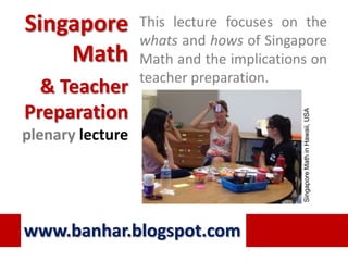 This document discusses Singapore Math and teacher preparation. It focuses on the approach of Singapore Math, which emphasizes problem solving, conceptual understanding, and thinking. It outlines the framework for preparing teachers to teach mathematics in this way, which includes having teachers learn content conceptually and the corresponding pedagogical knowledge. Courses in Singapore help teachers develop as learners and observers by giving opportunities to study math lessons.