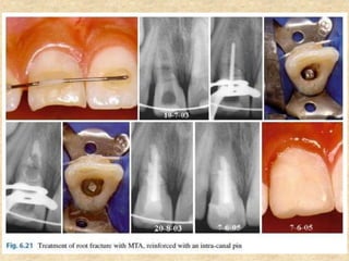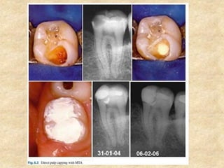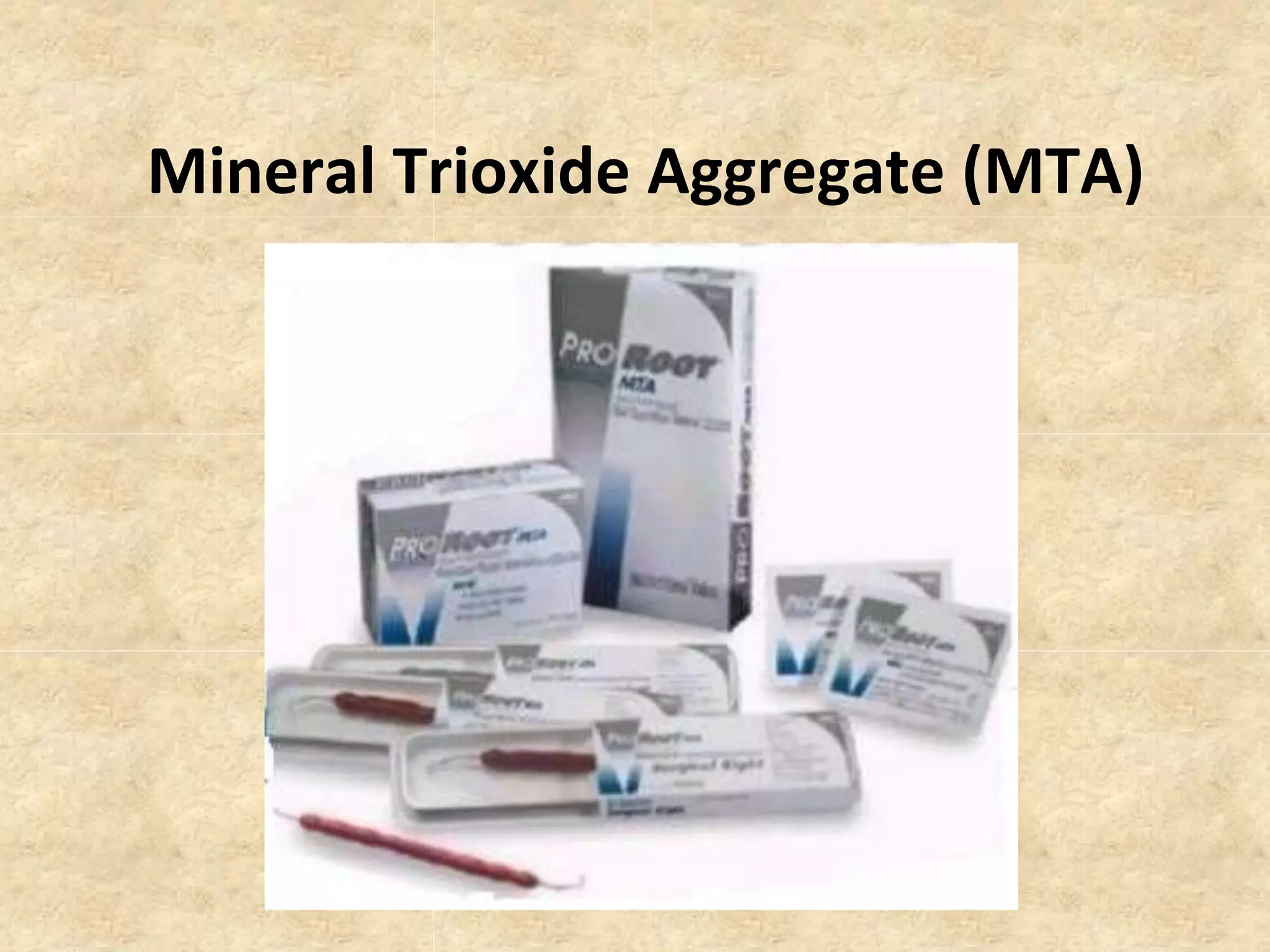 MTA was introduced in 1993 and approved by the FDA in 1998. It exhibits good biocompatibility, sealing ability, and tissue regeneration. MTA is available as grey or white powders mixed with water. It has a high pH and compressive strength increases over time. MTA has applications in pulp capping and non-vital pulpotomies due to its biocompatibility and ability to stimulate hard tissue formation and repair.
