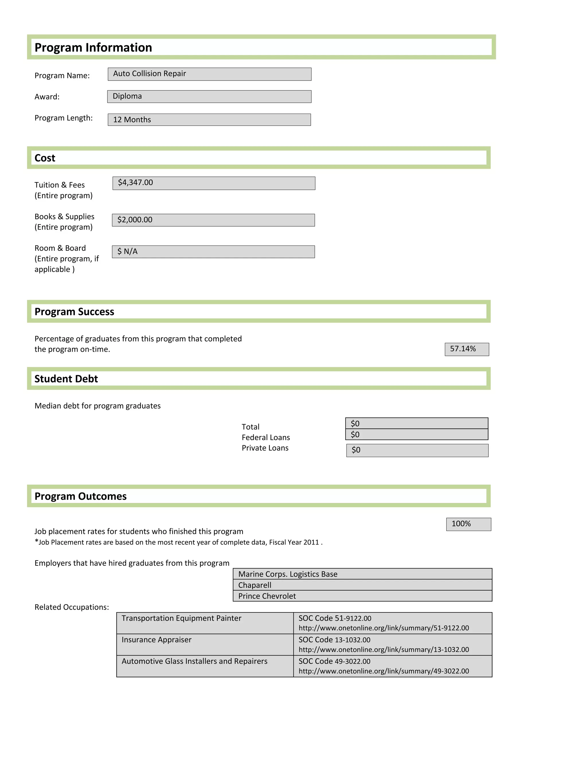 The Auto Collision Repair program is a 12-month diploma program with tuition and fees of $4,347 and estimated books and supplies costs of $2,000. 57.14% of students complete the program on-time. Graduates have a 100% job placement rate and employers who hire graduates include Marine Corps Logistics Base, Chaparell, and Prince Chevrolet. The program prepares students for occupations in transportation equipment painting, insurance appraising, and automotive glass installation and repair.