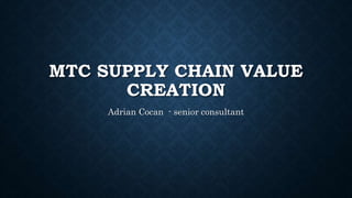 This document proposes a strategy to improve the supply chain and reduce costs for MTC, a healthcare provider with 80 hospitals in the area. The strategy involves 3 phases: 1) Improving the business model long-term by bringing sterilization in-house, using smart kiosks, and online customer assistance. 2) Redesigning the organization structure medium-term. 3) Implementing cost savings actions short-term. The proposed changes could generate a total cost savings of 17.4% and $38 million in additional annual profit through steps like closing warehouses, reducing inventory, downsizing salesforce, and moving to online customer support.