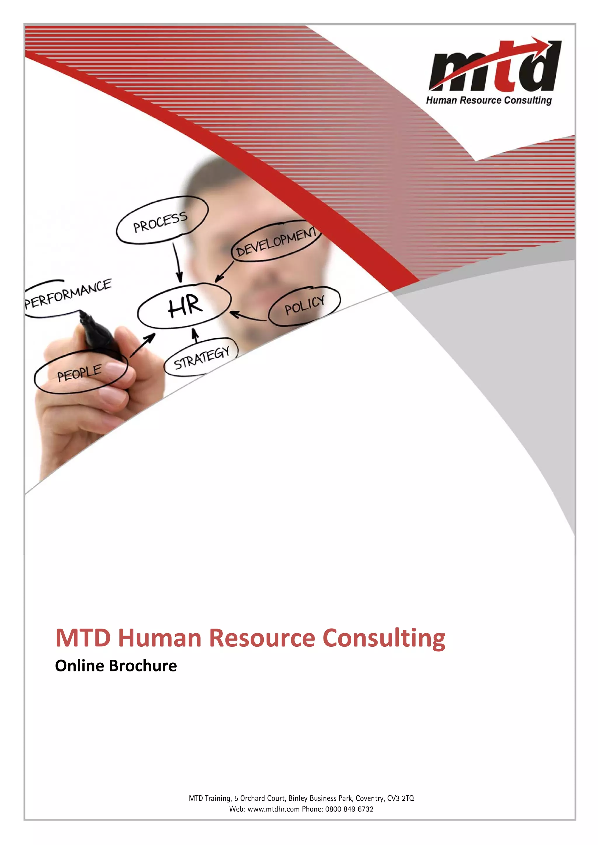 The document is a brochure from MTD Human Resource Consulting that outlines their services. They provide customized HR solutions and aim to add value beyond expectations. Their services include organization design and strategy, job analysis and role profiling, recruitment and selection, and retention strategies. They take a consultative approach and ensure legal compliance in all their work.