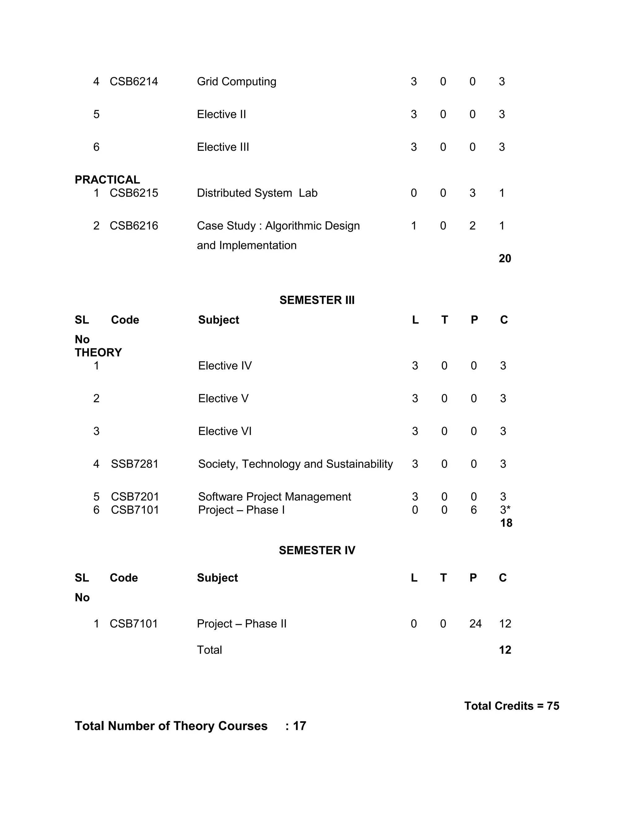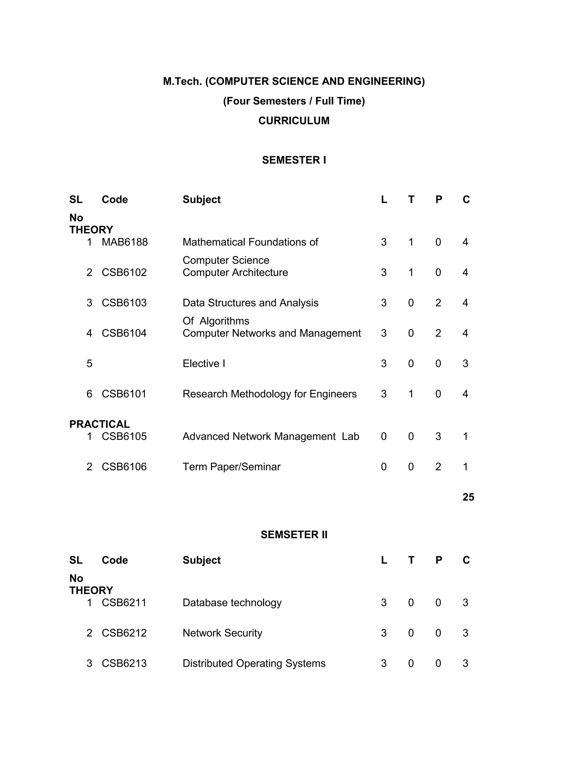 This document outlines the curriculum for a Master of Technology (Computer Science and Engineering) degree program. It includes the course requirements and electives for each of the four semesters. In the first semester, students will take courses in mathematical foundations, computer architecture, data structures and algorithms, computer networks, and research methodology. They will also complete labs in network management and a term paper. The subsequent semesters include additional theory courses, labs, and electives in areas such as databases, distributed systems, software engineering, and a capstone project. The degree requires a total of 75 credits over four semesters.