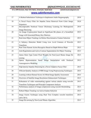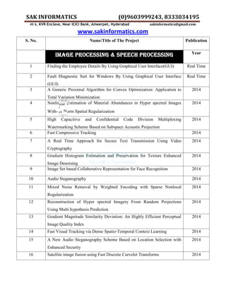 This document contains a list of 81 projects related to image processing, speech processing, communication, and signal processing conducted by SAK Informatics between 2012-2014. The projects covered topics including image denoising, object tracking, steganography, medical image analysis, adaptive filtering, OFDM, and more. SAK Informatics is a research organization located in Hyderabad, India that focuses on projects in these technical areas.