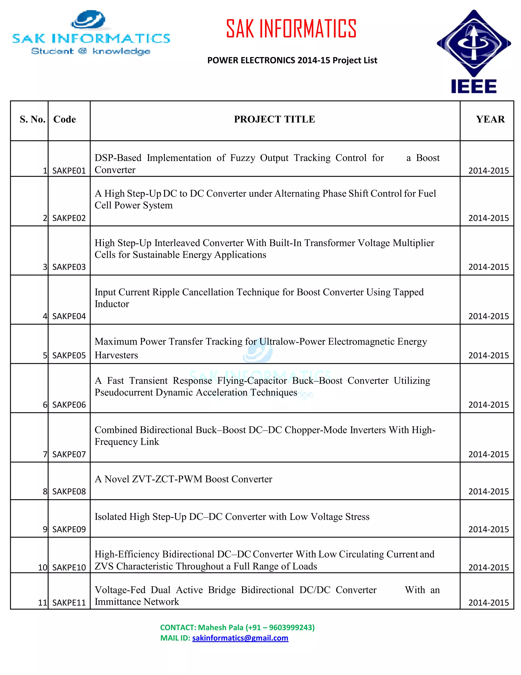 This document lists 107 power electronics projects conducted by SAK Informatics between 2014-2015. It provides the project codes, titles, and years for each project. It also lists the contact information for Mahesh Pala and the company email address.
