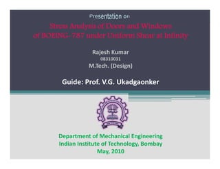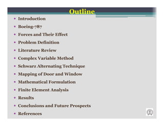 This document summarizes a thesis analyzing stress concentrations around doors and windows on the Boeing 787 aircraft under uniform shear loading. It presents analytical solutions using complex variable and Schwarz alternating techniques to model openings as rectangular holes in an infinite plate. Finite element analysis is also conducted and results show good agreement with analytical solutions. Stress concentrations are highest at corners and depend on geometry. Door and window interaction increases window stresses up to 4.8% but negligibly impacts door stresses.