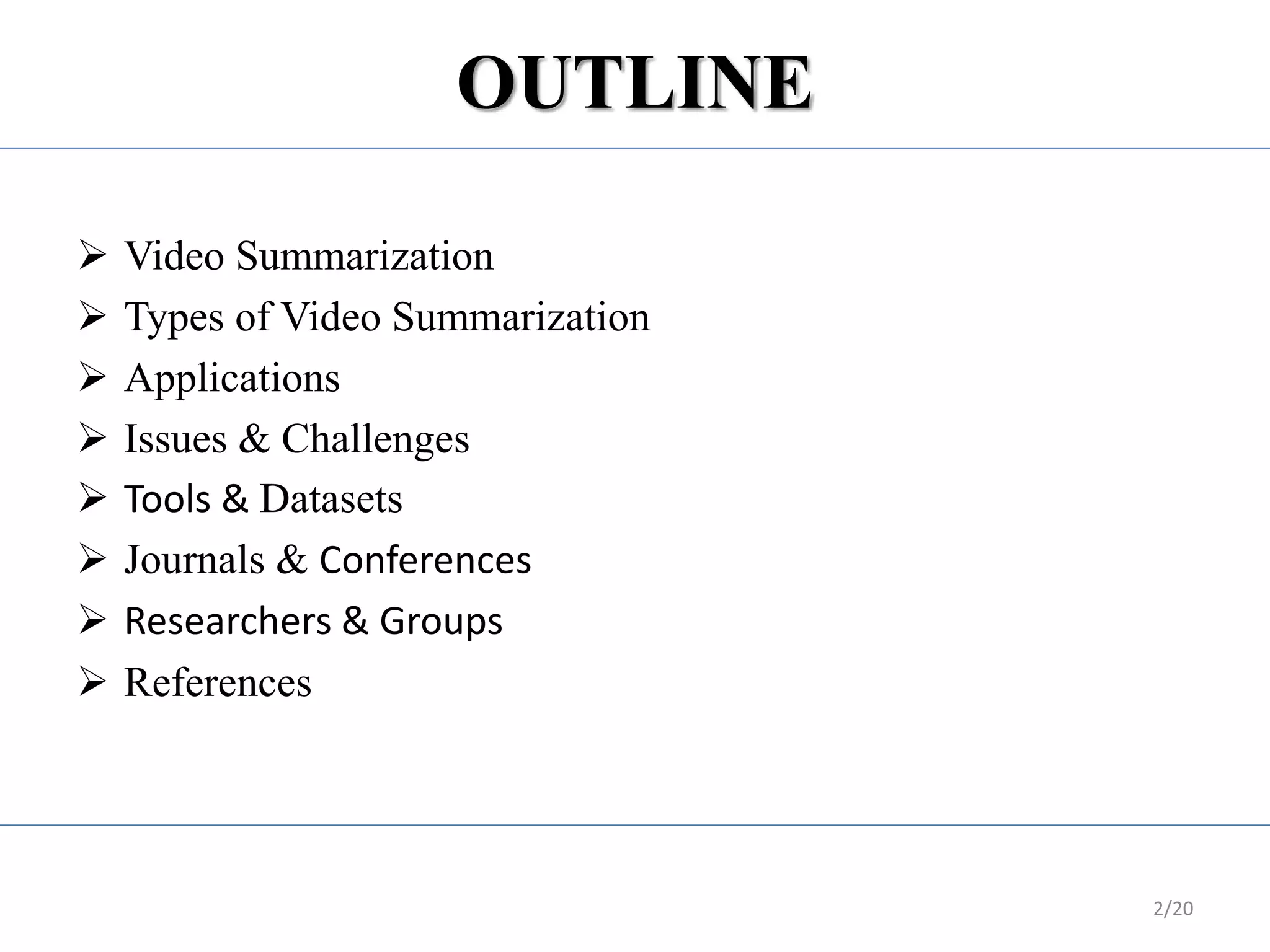 This document summarizes Neeraj Baghel's first progress presentation on video summarization. It discusses key aspects of video summarization such as types (key frame extraction and video skims), applications (browsing recorded content, databases, surveillance), challenges (information loss, computation cost, performance evaluation), tools, datasets, conferences, and researchers. The presentation outlines techniques for intelligently summarizing lengthy videos to capture the essence and remove redundant information.