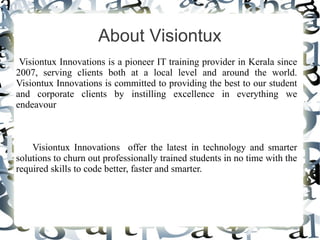 Visiontux Innovations is an IT training provider in Kerala since 2007, offering IEEE and live projects in various domains such as image processing, artificial intelligence, and software engineering. The organization focuses on delivering customized schedules and market-driven approaches to equip students with essential skills. They cater to both local and global clients, emphasizing industry-driven training models.