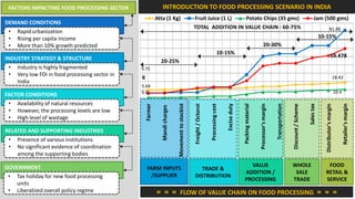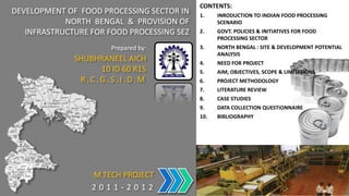 The document analyzes the development potential of the food processing sector in North Bengal, India, highlighting current government policies, initiatives, and the existing infrastructure for food processing. It emphasizes the need for improved industrial zones to enhance the supply chain, reduce waste, and meet growing consumer demand for processed foods. Additionally, it discusses the challenges faced by the industry, including low foreign direct investment, taxation issues, and regional instability, while outlining strategies for increasing production and processing levels.