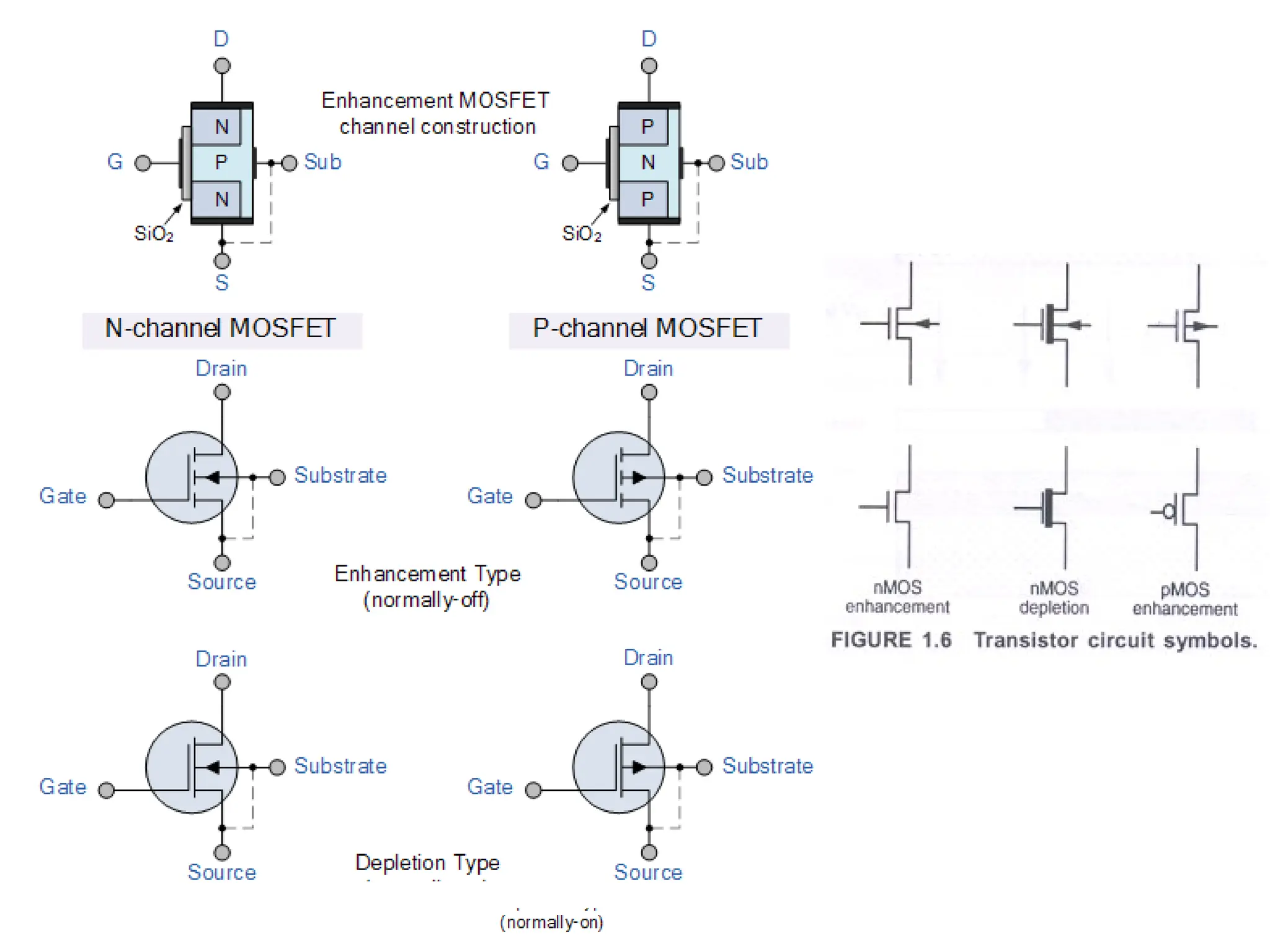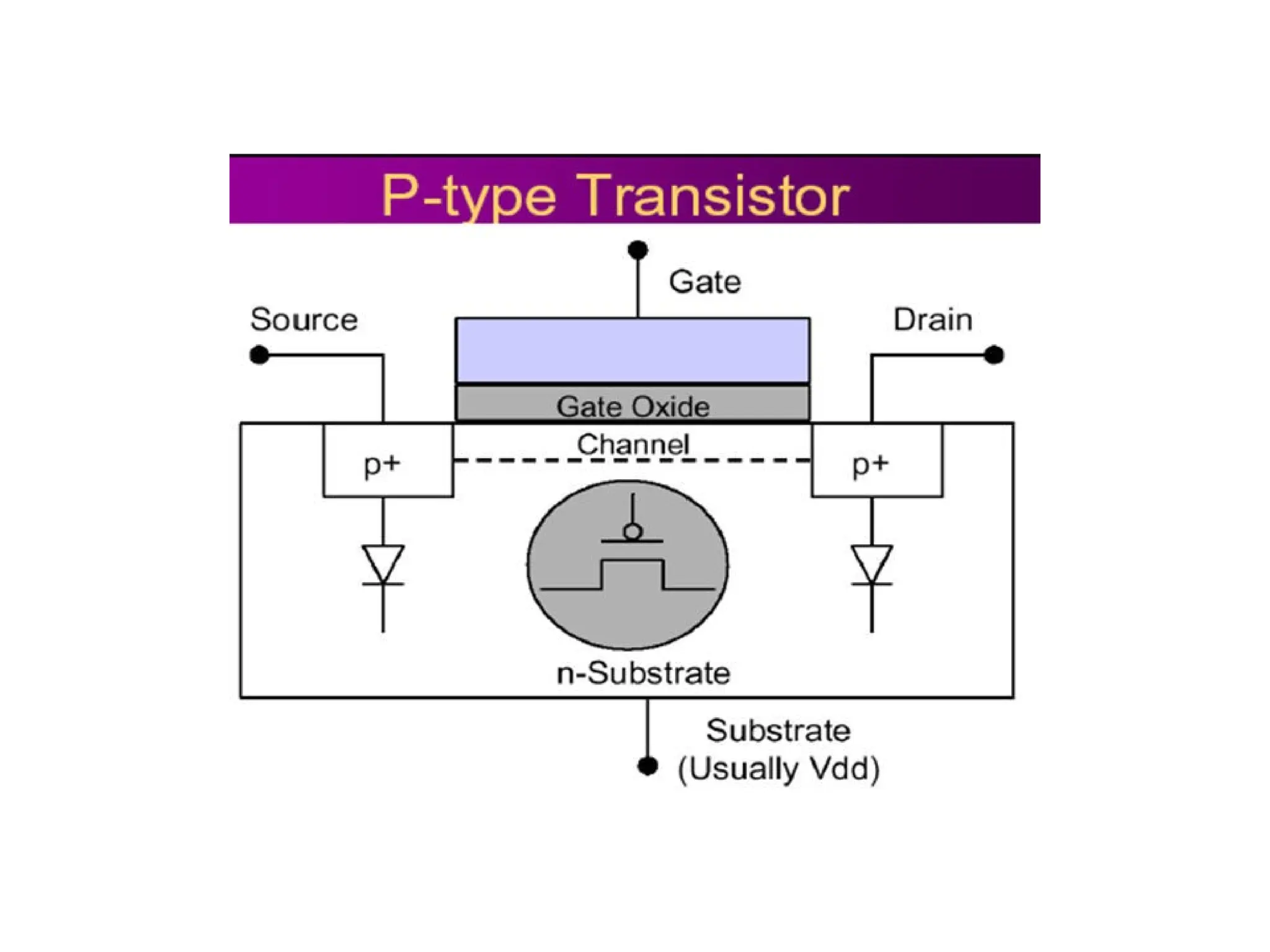 •p-type source and drain regions in n-type substrate.