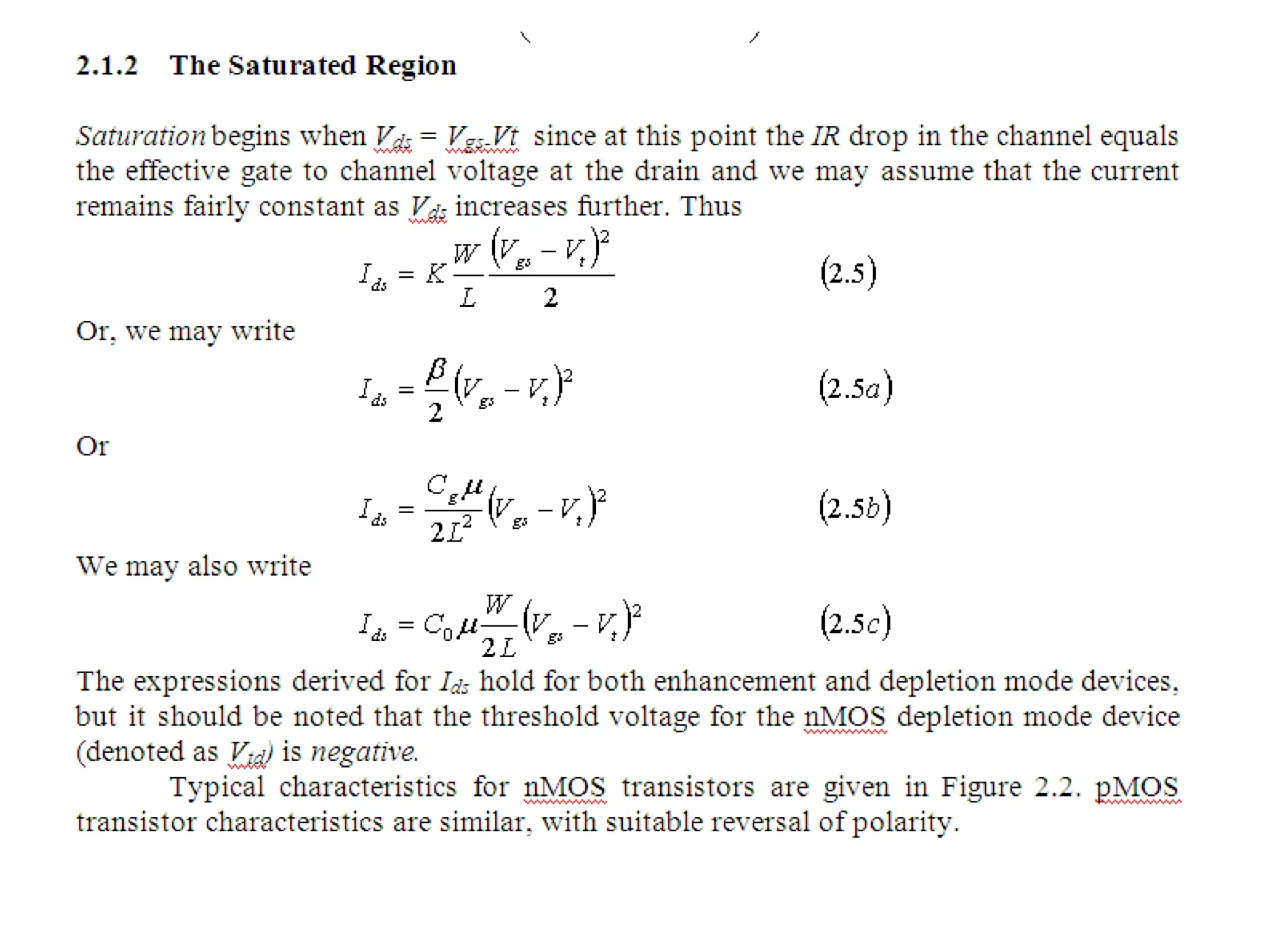 • Depletion Mode -If 0<Vgs< Vtn, the region under gate will