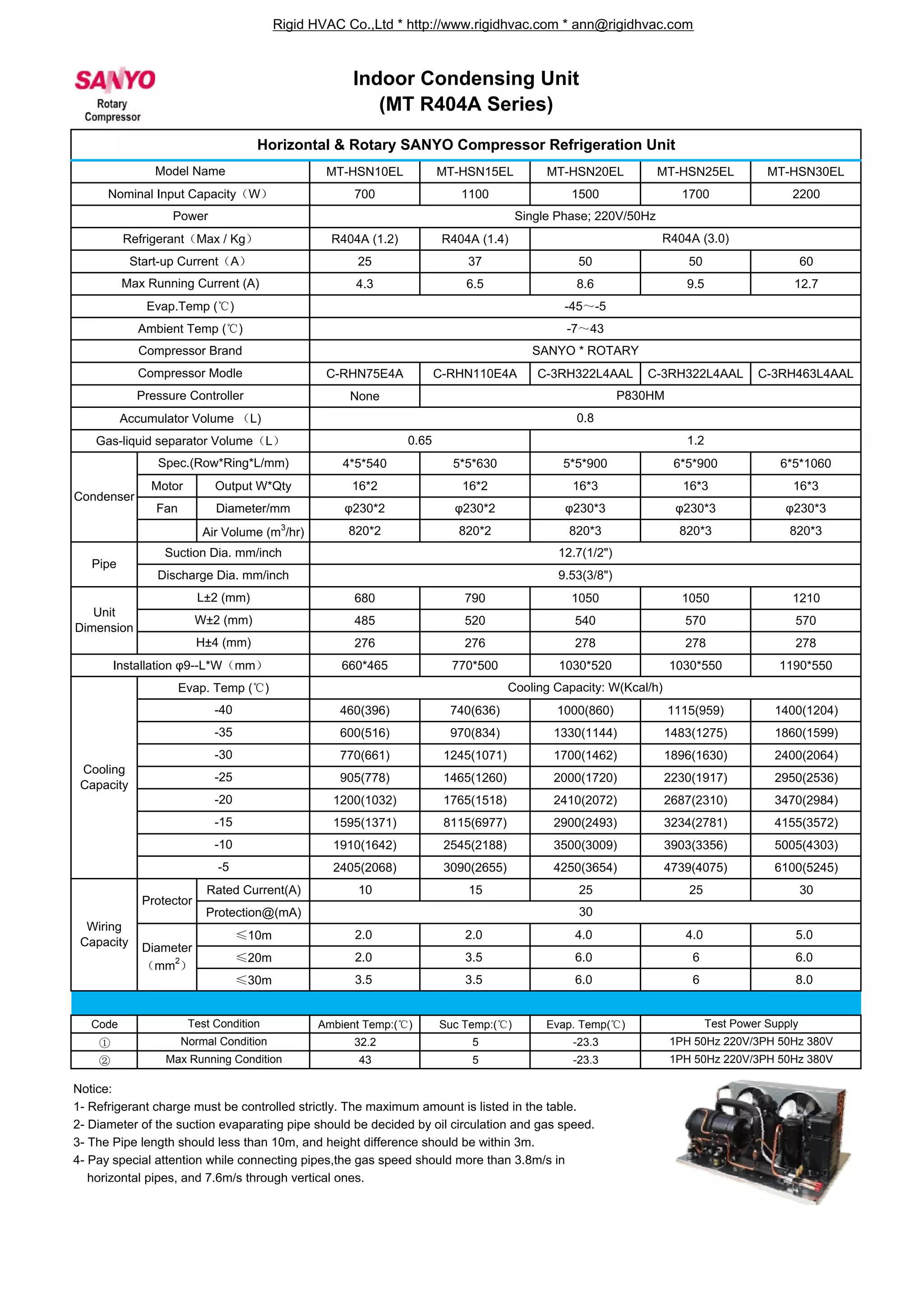 This document provides specifications for Rigid HVAC Co.,Ltd's indoor condensing unit models. It lists 10 models of horizontal and rotary compressor refrigeration units made by SANYO, including their nominal input capacities ranging from 700 to 2200 Watts. It also lists 5 larger horizontal and rotary compressor units made by SANYO, including their cooling capacities at various temperatures and electrical specifications. Installation guidelines are provided at the end regarding refrigerant charge amounts, pipe diameters and lengths, and gas flow speeds.