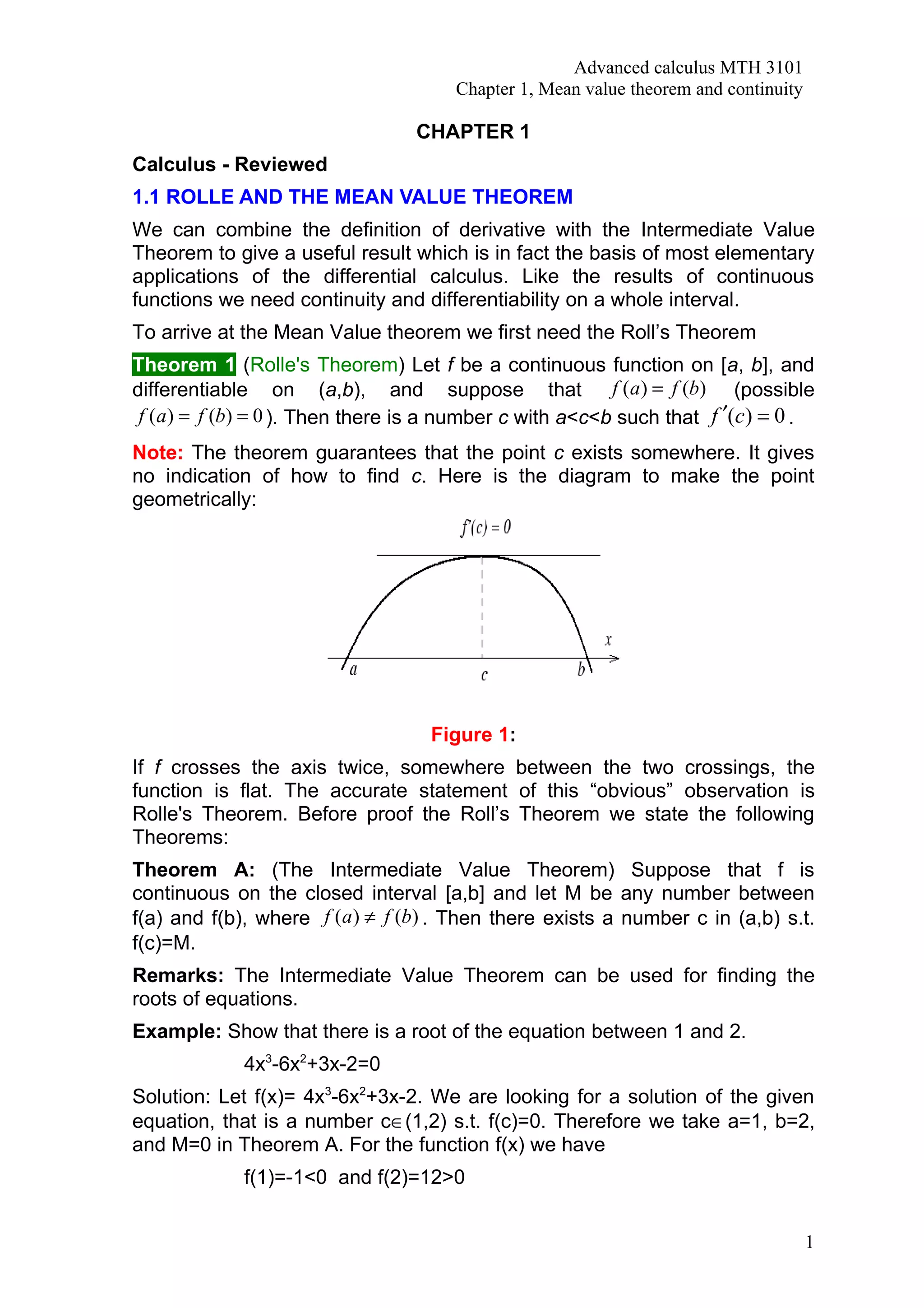 This document discusses the mean value theorem and continuity in calculus. It defines Rolle's theorem, which states that if a function is continuous on a closed interval and differentiable on the open interval, and if the function is equal at the endpoints, then its derivative must be equal to zero for at least one value between the endpoints. It then uses Rolle's theorem to prove the mean value theorem, which states that the rate of change of a function over an interval is equal to the derivative of the function at some value between the endpoints. Finally, it introduces the Cauchy mean value theorem, which relates the rates of change of two functions over an interval to their derivatives at some interior point.