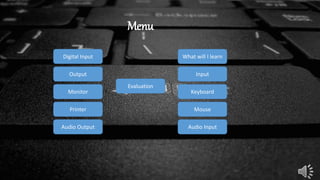 The document discusses input and output devices for computers. It covers various input devices like keyboards, mice, microphones for audio input, and digital cameras. It describes the functions of keyboards, mice, and other pointing devices. It also discusses output devices like computer monitors and printers. Monitors display visual output and come in CRT and LCD varieties. Printers produce physical copies and come in inkjet and laser varieties. The document provides details on the characteristics and uses of these common input and output computer devices.