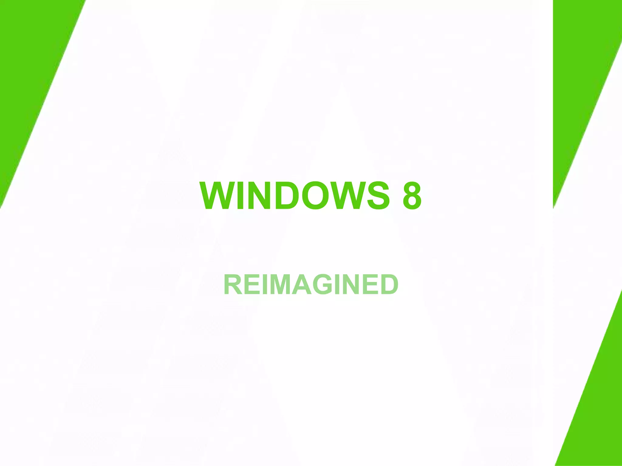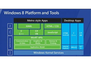 Windows 8 features a touch-first "Metro" user interface designed for tablets and touchscreens. It emphasizes tile-based "Metro Style Apps" that are optimized for touch input and snap views. The operating system also includes updated versions of Internet Explorer and other apps redesigned according to Metro principles of clean typography, fluid interactions, and cloud connectivity.