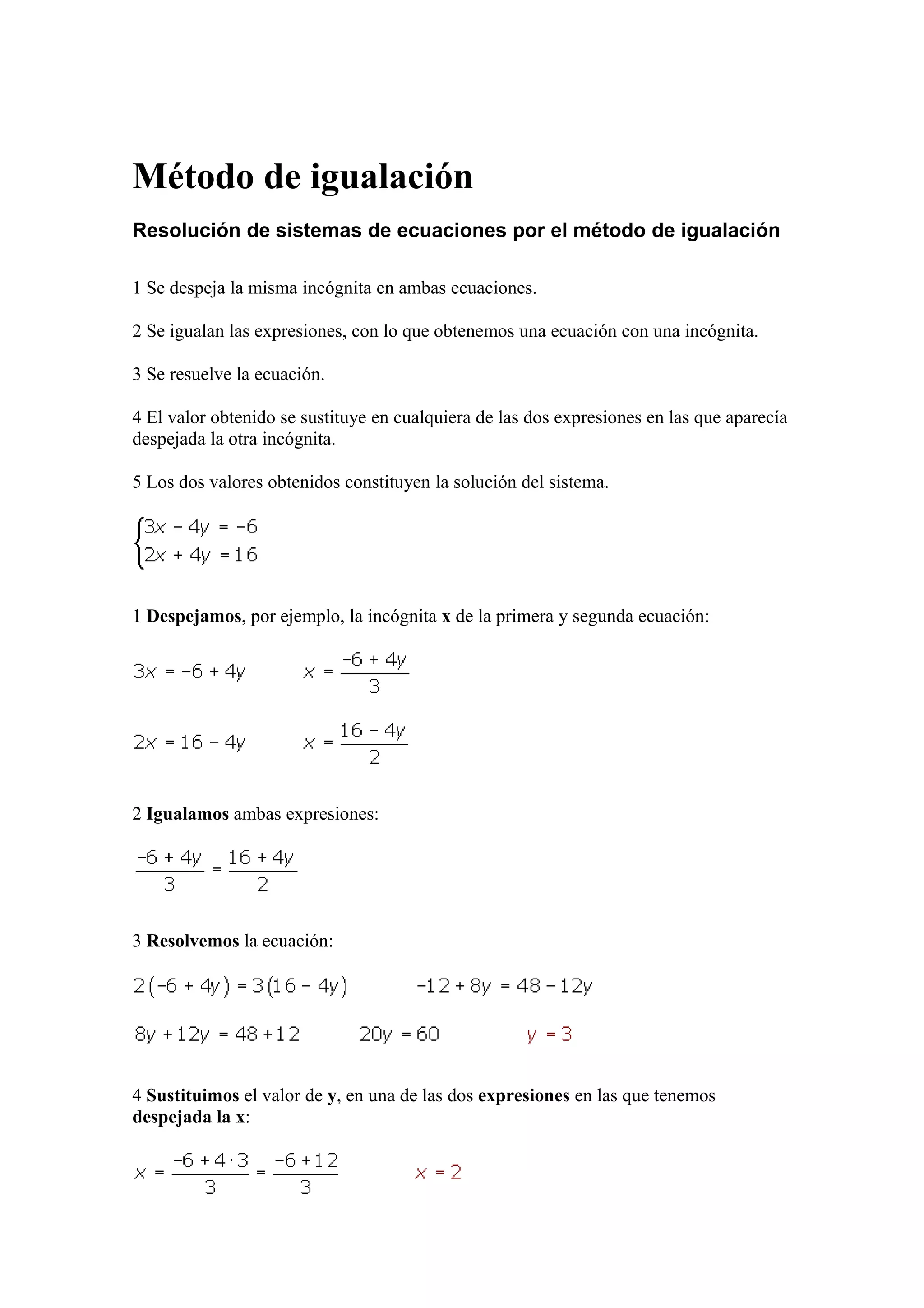 El documento describe el método de igualación para resolver sistemas de ecuaciones. Este método implica 1) despejar la misma incógnita en ambas ecuaciones, 2) igualar las expresiones para obtener una ecuación con una incógnita, 3) resolver la ecuación para encontrar el valor de la incógnita, y 4) sustituir este valor en la otra ecuación para encontrar el valor de la segunda incógnita.