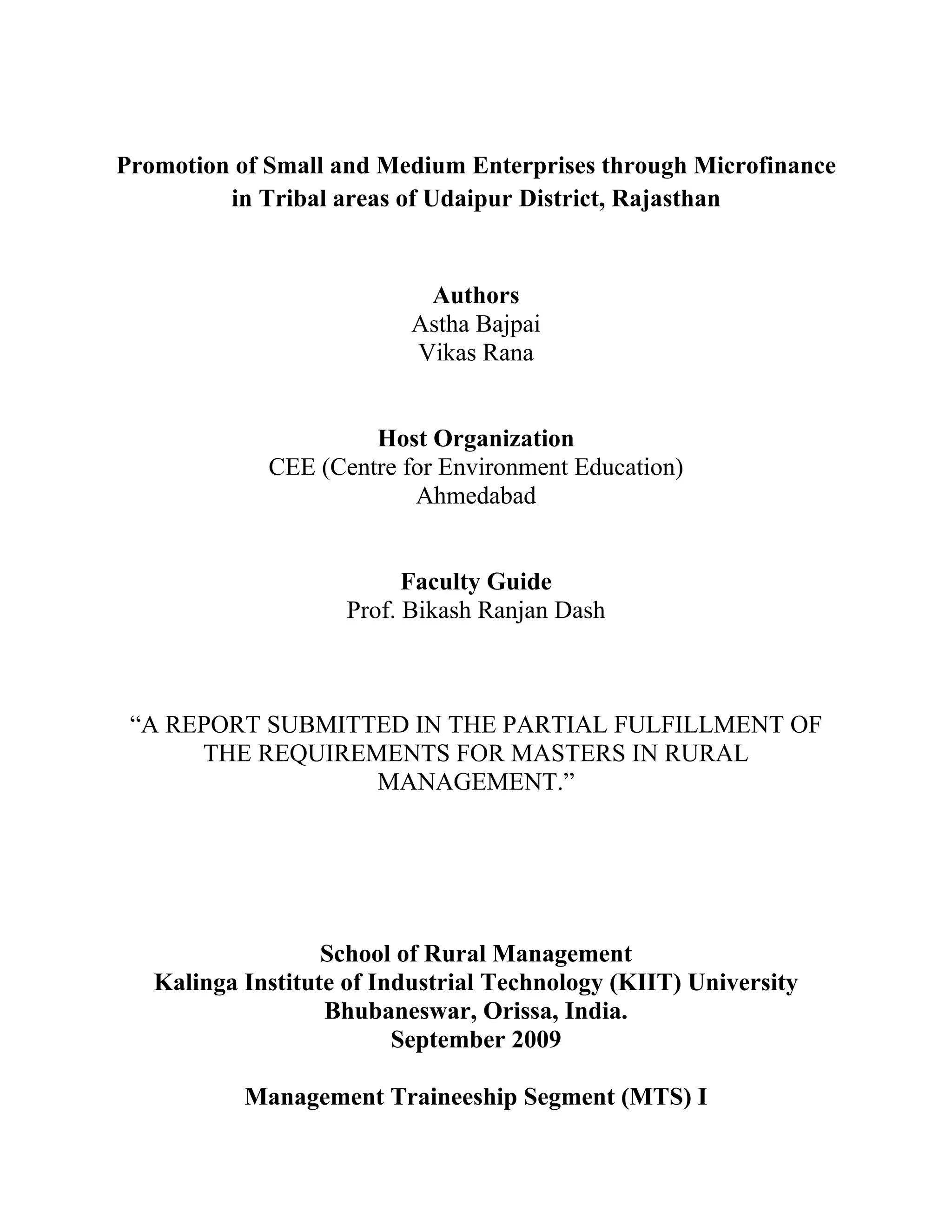 This document summarizes a study on promoting small and medium enterprises through microfinance in tribal areas of Udaipur district, Rajasthan. The study was conducted by two students, Astha Bajpai and Vikas Rana, for their Master's degree program at Kalinga Institute of Industrial Technology University.