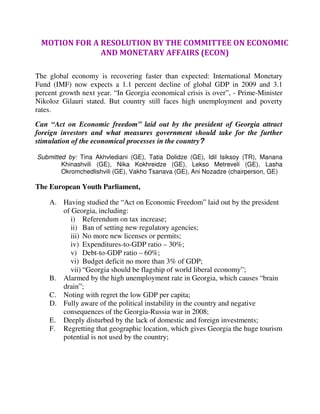 - The document discusses resolutions from the European Youth Parliament's regional session in Georgia regarding economic, cultural, educational, and foreign affairs issues in the country.