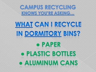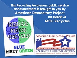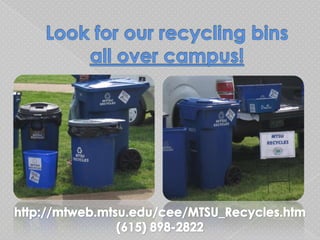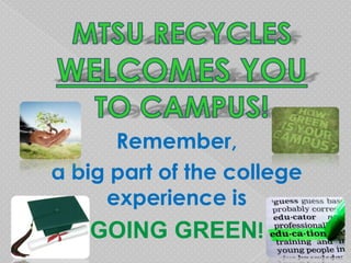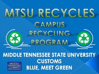The document emphasizes the importance of recycling at MTSU and provides guidance on what materials can be recycled on campus, including various types of paper, plastics, and aluminum. It also highlights the e-waste recycling program and encourages students to adopt eco-friendly practices. Additional tips for reducing waste and saving energy are provided along with information on where to find recycling resources.