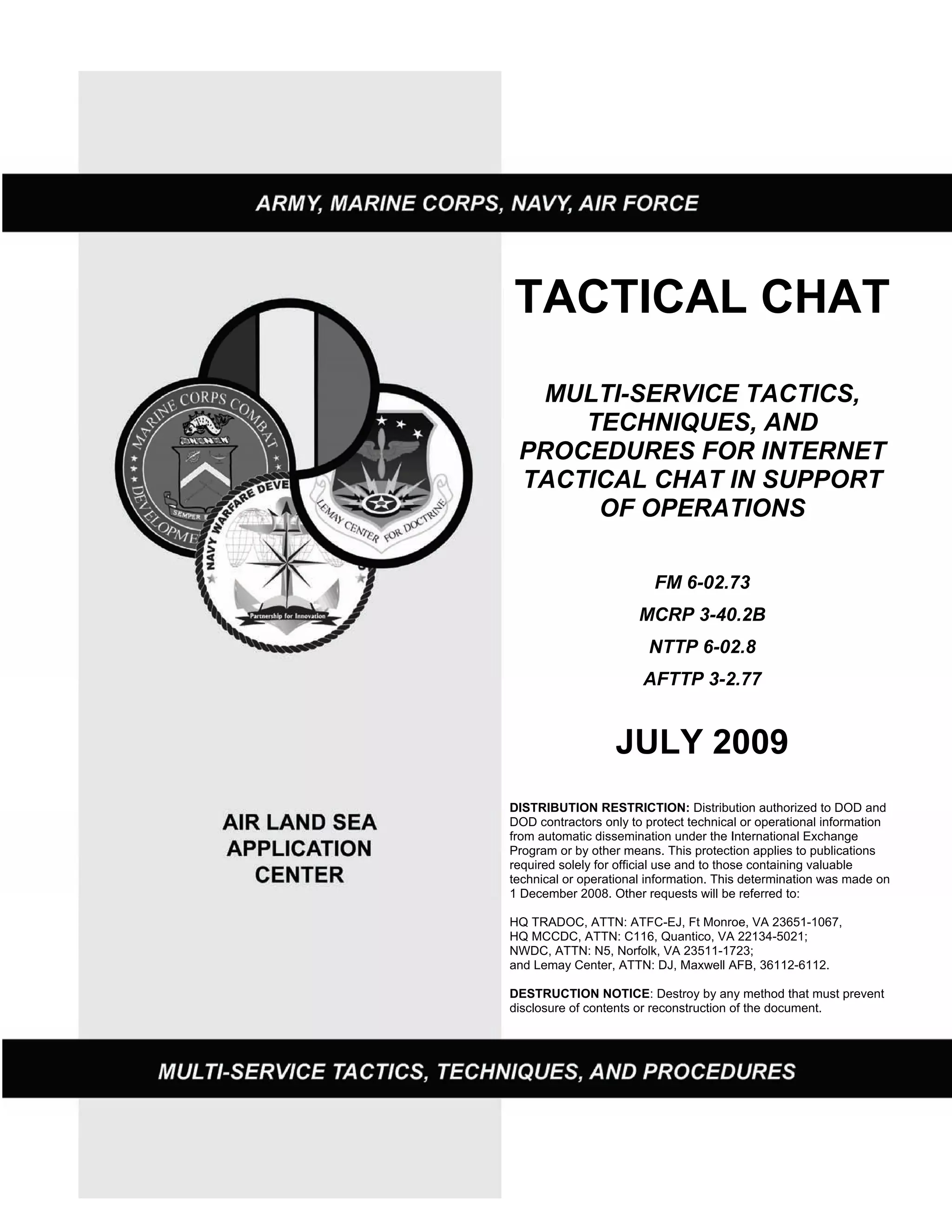 This document provides guidance on the use of internet tactical chat (TC) to enhance communications and situational awareness for military operations. It establishes standardized procedures, terminology and management techniques for employing TC across the services. The document describes the basic capabilities and limitations of TC, and how it can be used at the tactical level to coordinate activities and pass time-sensitive information. It includes details on connecting to TC networks, communicating effectively via chat rooms, and troubleshooting potential issues. The overall purpose is to maximize the flow of coordinating information through TC while minimizing risks.