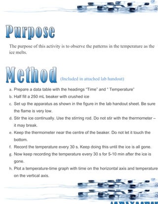 The document describes an experiment to observe the temperature changes that occur when ice melts. Key findings include: