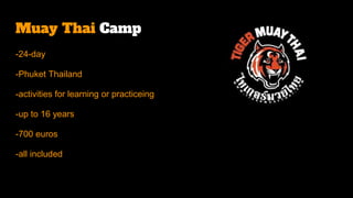 Muay Thai summer camp is a 24-day camp held in Phuket, Thailand for ages up to 16 years old, costing 700 euros which includes all activities, lessons, and accommodations for learning and practicing Muay Thai techniques and skills.