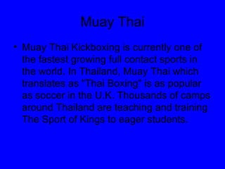 Muay Thai originated over 1000 years ago in Thailand and involves common blows like elbow thrusts, knee strikes, and high kicks that can result in death or injury. Kickboxing originated more recently in the 1970s from martial arts in Asia and focuses more on punching and kicking with safety rules and protective gear. While both involve kicking and punching, Muay Thai emphasizes knee and elbow strikes as decisive blows and originated as combat techniques, whereas kickboxing emphasizes safety and originated as a competitive sport.