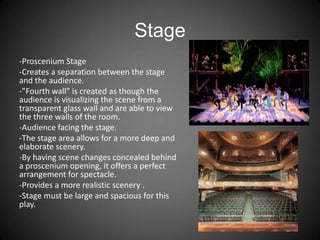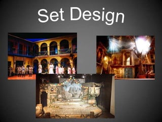 The document discusses considerations for designing the stage and scenery for a production of Shakespeare's play "Much Ado About Nothing." It notes that the play is set in 1600s Messina, Italy and should establish a mood that is festive, romantic, and celebratory to contrast with the ongoing war mentioned in the play. The design concept is an idyllic setting away from war where the characters can enjoy witty banter. A key part of the setting is Leonato's house, which represents different locations in the play and creates an illusion of a lively environment. The stage design must solve practical problems like setting changes while maintaining a unified concept consistent with the director's vision.