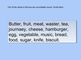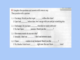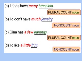 This document provides instruction and examples for using the quantifiers "much", "many", "some", "any", "a little", "a few", and "a lot" correctly in sentences. It explains that "much" is used with non-count nouns and "many" with plural count nouns. Examples are given comparing the use of these quantifiers in different contexts. Readers are asked to complete sentences using the correct quantifier.
