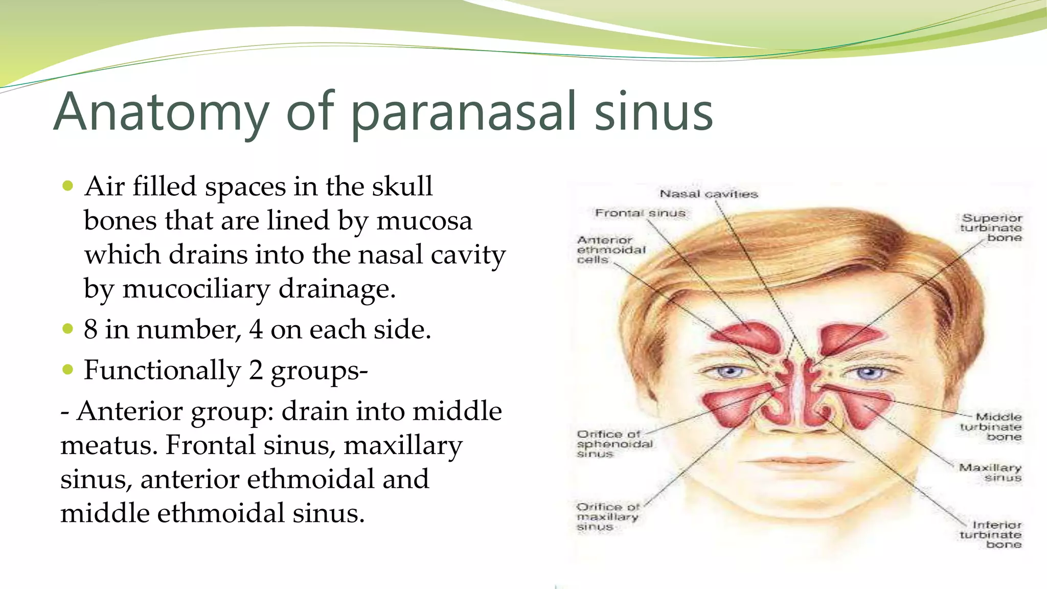 The document outlines the anatomy and function of paranasal sinuses, detailing their drainage mechanisms into the nasal cavity through mucociliary action. It discusses the mucous blanket's role in trapping pathogens and transporting mucus, emphasizing the significance of ciliary movement in sinus clearance. The principles of functional endoscopic sinus surgery (FESS) are also described, focusing on restoring ventilation and mucociliary function while preserving healthy tissue.