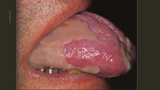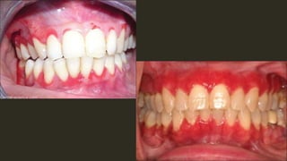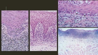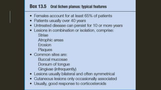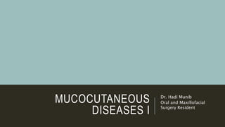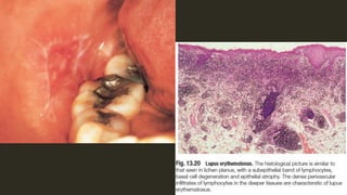 This document outlines several mucocutaneous diseases that can present in the oral cavity, including lichen planus, lupus erythematosus, chronic ulcerative stomatitis, and pemphigus vulgaris. It discusses the differences between oral and skin lesions, diagnostic tests like immunofluorescence, and the clinical features and management of these conditions. Key histological findings that can help differentiate lichen planus from lupus erythematosus are mentioned.