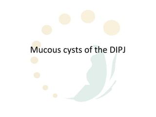 Mucous cysts of the DIPJ usually occur in older adults and are associated with osteoarthritis. They contain mucin and form from degeneration of joint structures. Clinically, they appear as nodules near the DIPJ that can cause nail deformities. Treatment involves surgical excision, sometimes with additional procedures like osteophyte removal. Complications include residual deformities, stiffness, skin issues, and recurrence due to incomplete excision or persistent arthritis.