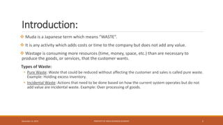 This document discusses the concept of muda or waste in manufacturing. It defines the 8 types of muda as overproduction, inventory, waiting, transportation, overprocessing, defects, motion, and unused employee skills. For each type of waste, the document provides examples, common causes, and strategies to eliminate the waste such as just-in-time production, standard work procedures, effective layout and organization, and involving employees. The overall goal is to identify and remove non-value adding activities to improve efficiency in manufacturing.