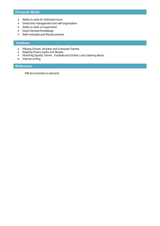 Muhammad Mudassir is seeking a position in accounts and finance to further develop his knowledge and skills. He has a Bachelor of Commerce degree from Jinnah Islamia College of Commerce and is a certified cost and management accountant. His experience includes auditing income and expenses for the Lahore School System and analyzing accounting records for Chawala Aluminum. He is proficient in English, Urdu, and Punjabi and has strong computer skills. His personal attributes include the ability to work unlimited hours independently and manage his time well while being self-motivated and results-oriented.