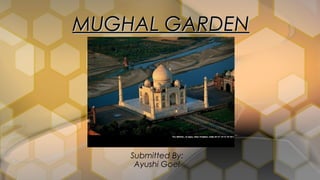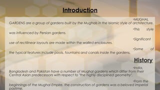 The Mughal gardens are a group of gardens built by the Mughals in the Islamic style of architecture, influenced by Persian gardens. They use rectilinear layouts within walled enclosures and include features like pools, fountains, and canals. Significant Mughal gardens include the Taj Mahal in Agra, Humayun's Tomb in Delhi, and Shalimar Bagh in Kashmir, all following the charbagh design of being divided into quarters by water channels. These gardens exemplify Mughal horticultural and architectural styles through their symmetrical layouts, use of water, and placement of pavilions and plantings.