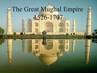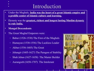 The Mughal Empire ruled northern India from 1526 to 1707, establishing the greatest, richest Muslim dynasty in India. Key emperors included Babur, who founded the empire; Akbar, who expanded it and promoted religious tolerance; Shah Jahan, a patron of the arts who built the Taj Mahal; and Aurangzeb, whose intolerance strained the empire. Under the Mughals, India saw a golden age of architecture, art, and culture. However, religious conflict and overexpansion eventually weakened the empire, leading to its decline in the early 18th century.