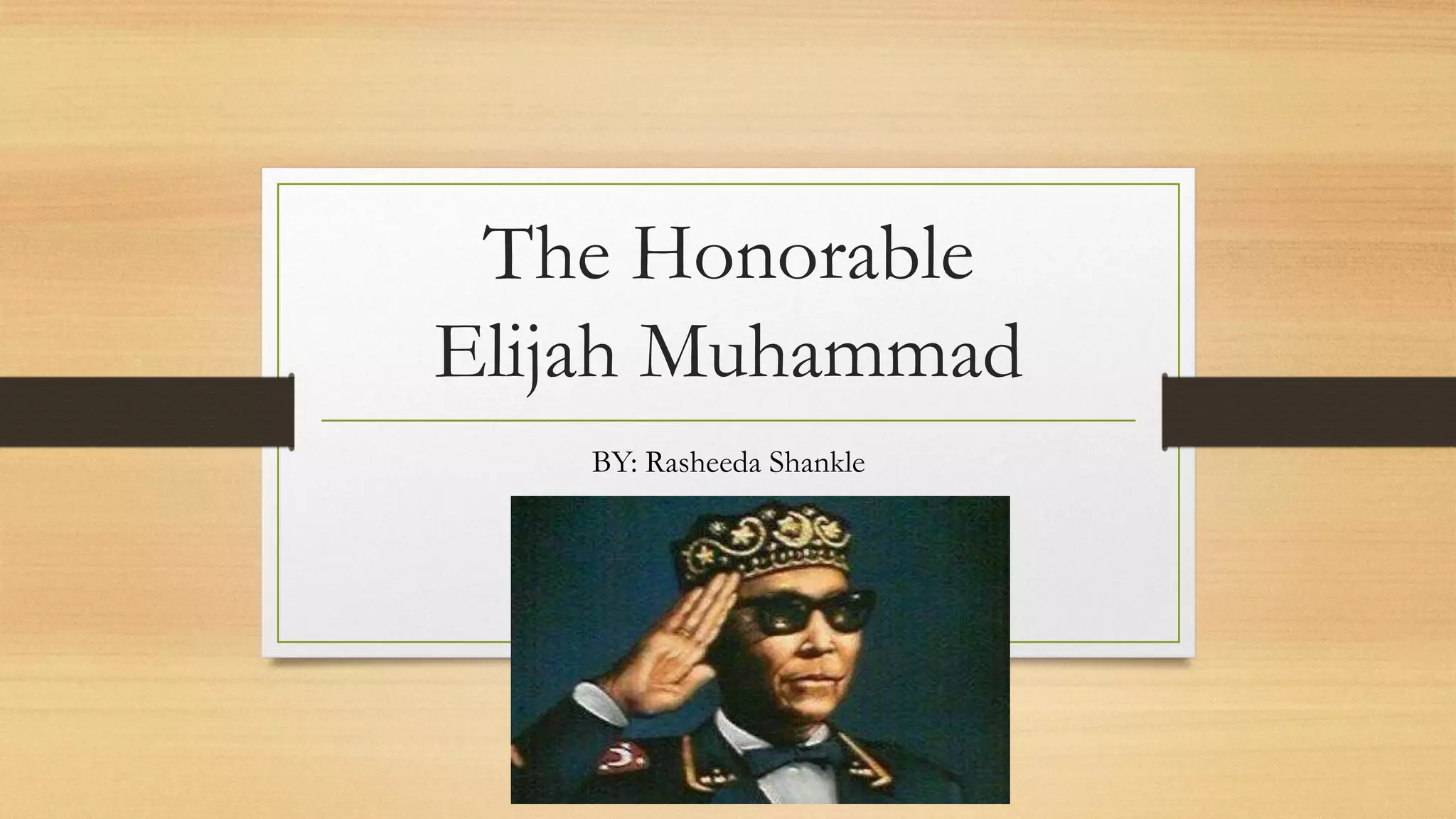 Elijah Muhammad was an African American religious leader who led the Nation of Islam from 1934 until his death in 1975. He mentored influential figures like Malcolm X and Muhammad Ali and grew the Nation of Islam from a small group to around 150,000 followers. After his death, the Nation of Islam split into different factions led by Warith Deen Mohammed and Louis Farrakhan. Elijah Muhammad preached the central tenets of the Nation of Islam, including the belief that black people are the original humans and white people were created by a black scientist. He authored several texts to spread the teachings of the Nation of Islam.