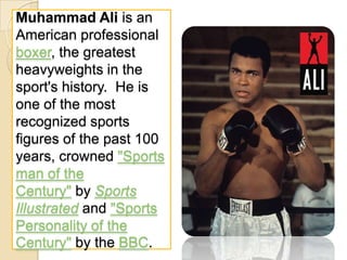 Muhammad Ali is an American professional boxer who is considered one of the greatest heavyweights in boxing history. He is one of the most recognized sports figures of the past 100 years, having been named "Sports man of the Century" by Sports Illustrated and "Sports Personality of the Century" by the BBC.