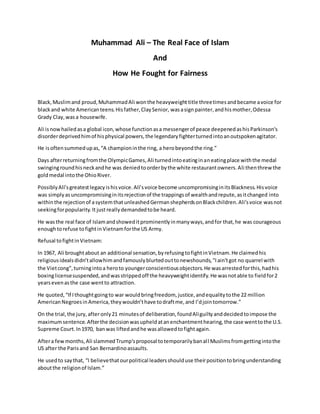 Muhammad Ali was a prominent Black Muslim boxer who became a voice for equality. He refused to fight in the Vietnam War due to his religious beliefs, which led to his boxing license being suspended for two years. Ultimately, the U.S. Supreme Court overturned his conviction. Ali advocated strongly for understanding of Islam and used his platform to promote peace, even as Parkinson's disease weakened him physically. He is remembered as a champion in the ring and a hero beyond it for his courage in standing up for his principles against discrimination.
